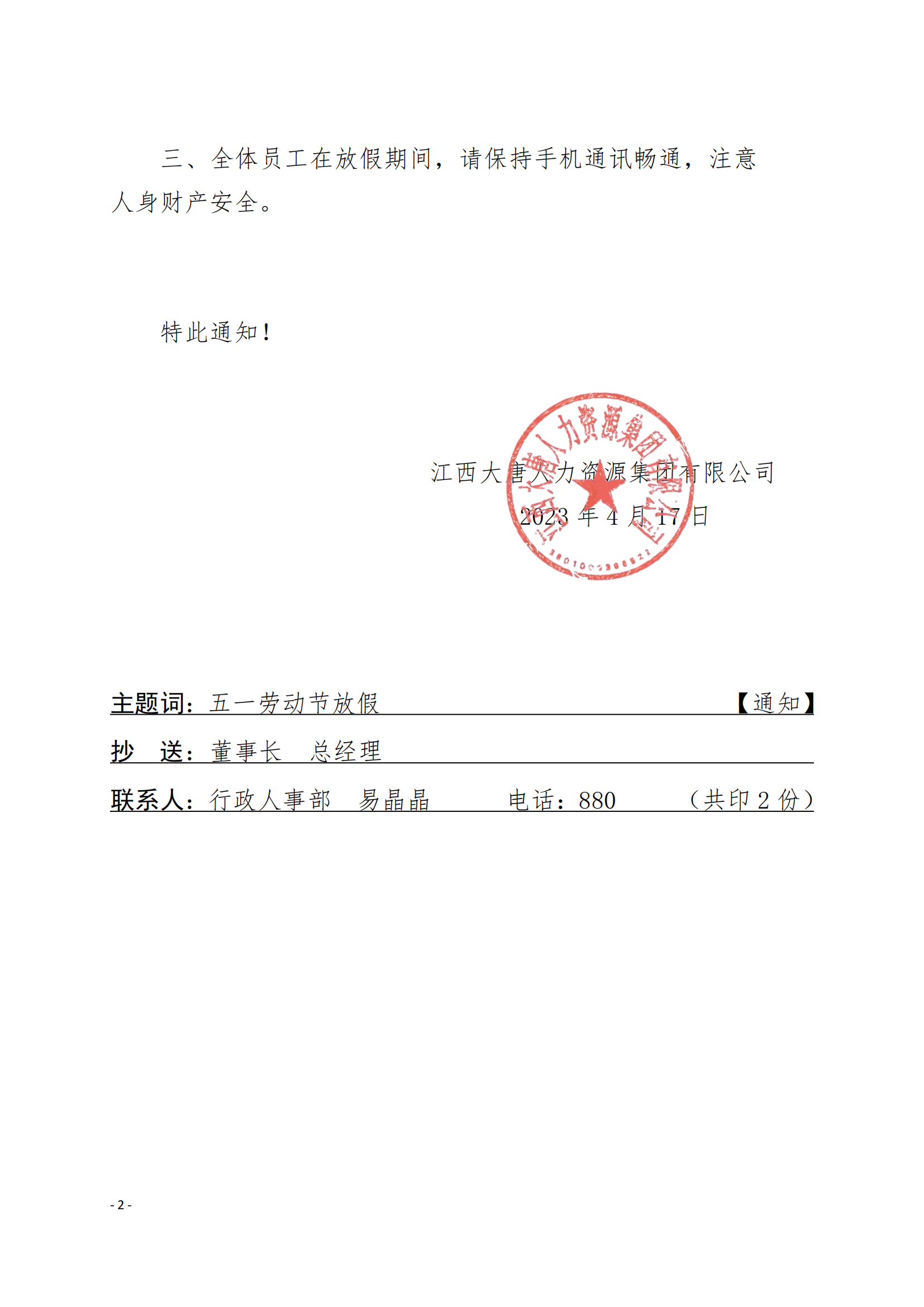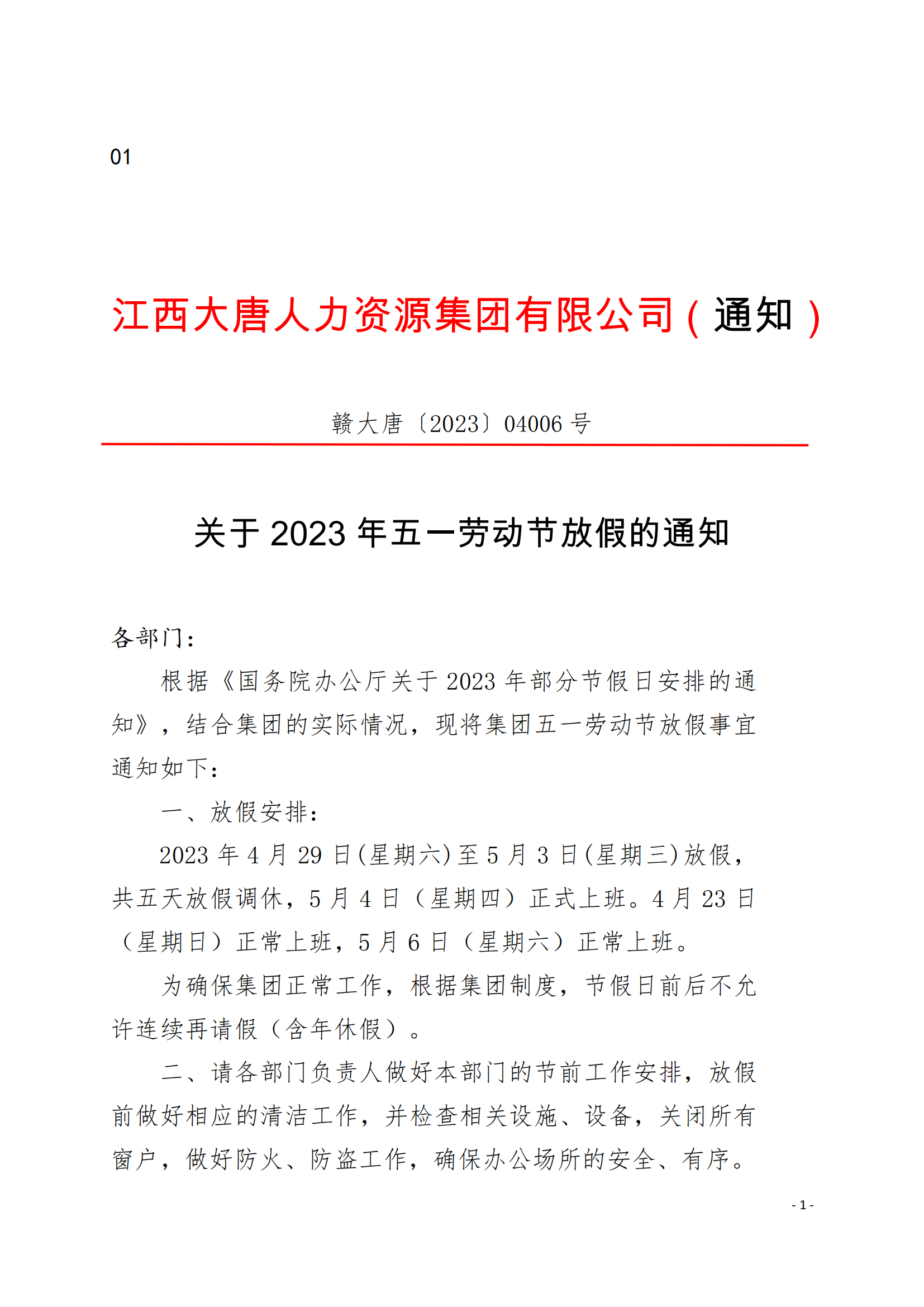 集團關于2023年五一勞動節(jié)放假的通知